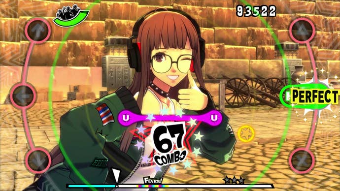 To best enjoy the truly silly dance choreography and the familiar stages (which range from Palaces in Persona 5 to the Tartarus in Persona 3), there are modes where you can kick back and watch with no obtrusive UI, or even in a fully Perfect run if you want to be jealous of a computer playing. On a television, especially a sizable one, it's easy to get cross-eyed while playing some of the faster tempo songs and higher difficulties. In the dozen-plus hours I spent playing through both games' tracklists on the PS4 (including repeating songs to unlock more Social events, which unlock after meeting certain requirements), I found myself wishing I was playing it on a smaller device. On the big screen, everything's so spread out that it's hard to follow sometimes, which culminates into one big headache.