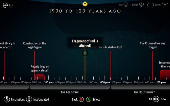 It soon turns daunting though, whether it's your first or third playthrough. With each new fact learned—whether from an artifact you discover, an etching of the Ancient language (merely called "Ancient") you find, or a conversation with an NPC—the vast timeline of the world grows, dating back anywhere from mere minutes to thousands of years ago. It's intimidating to sift through, and makes Aliya feel astoundingly small in the grand scope of this fascinating world we're traveling through with her.
